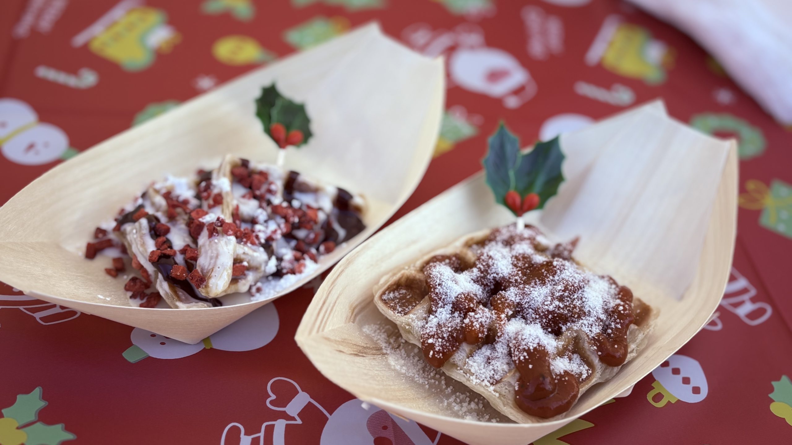 まずはオンラインやメールで打ち合わせ。試合日が12/20ということもあり、この日はクリスマス仕様のワッフルとなりました。また伊藤選手からミルクチョコ、井上選手からホワイトチョコ、両選手からベーコンピザ、容器は舟形などの提案をいただき、試作を重ねて完成したのがこちら。