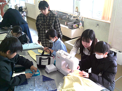 5年生の家庭科の授業で、お弁当包み制作指導のサポートにあたりました。学生と教員が、待ち針の留め方やしつけ・ミシン・アイロンのかけ方などを指導。参加した学生にとっても、子どもたちの笑顔を間近で感じられる活動です。