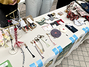 展示内容は、廃棄予定の材料や端切れを活用して制作した学生作品で、令和6年度服飾生活特別演習で制作したリフォーム作品3点。加えて、端切れを用いた小物制作のワークショップを実施し、ファッションサークル所属学生による作品の物販も行いました。ワークショップでは、小さなお子様から大人まで幅広く参加していただき、「リース」や「組みひものストラップ」「くるみボタンのヘアゴム」作りを体験していただきました。学生にとって、多くの市民の方と交流し、貴重な社会経験の機会となりました。